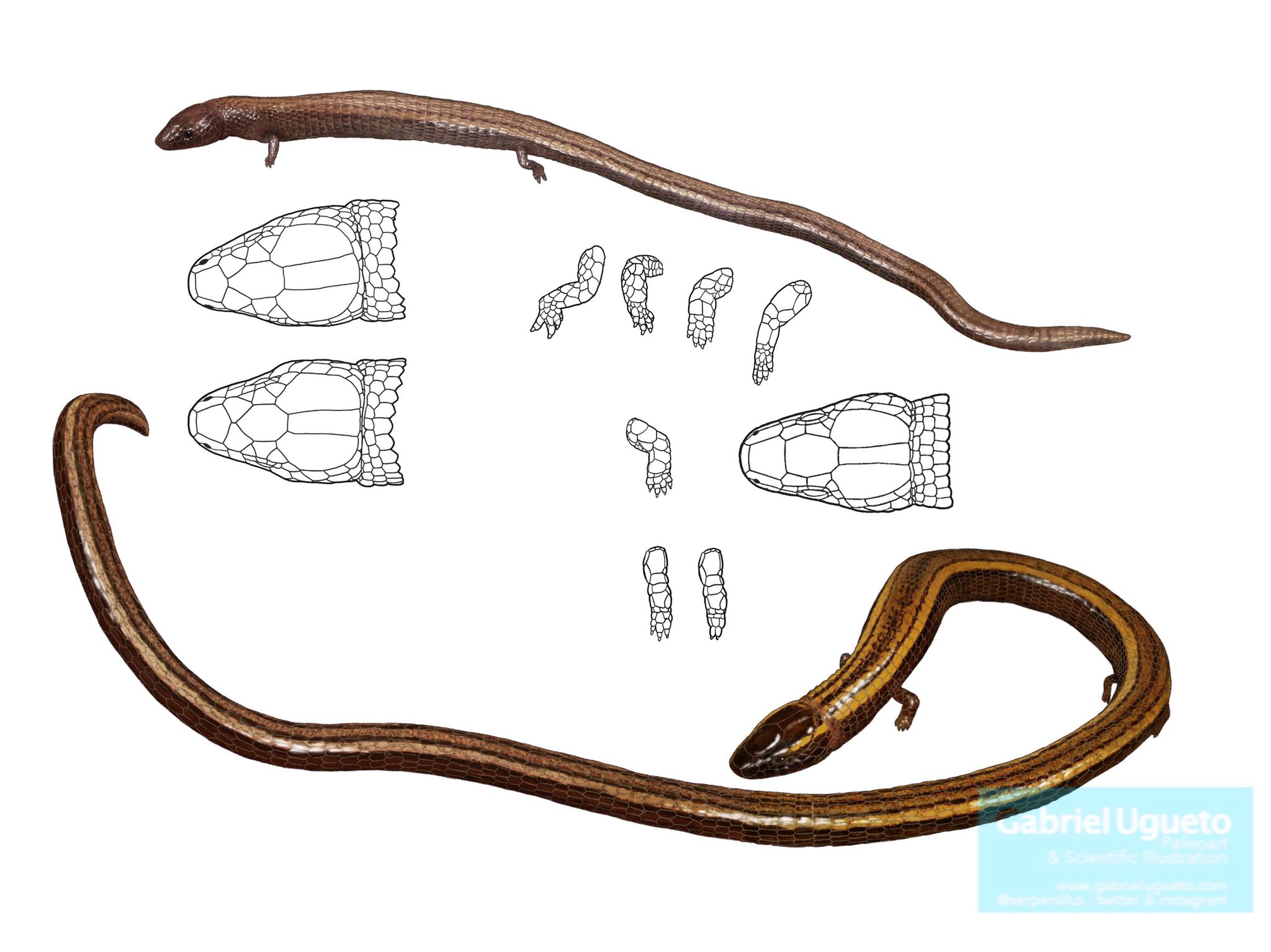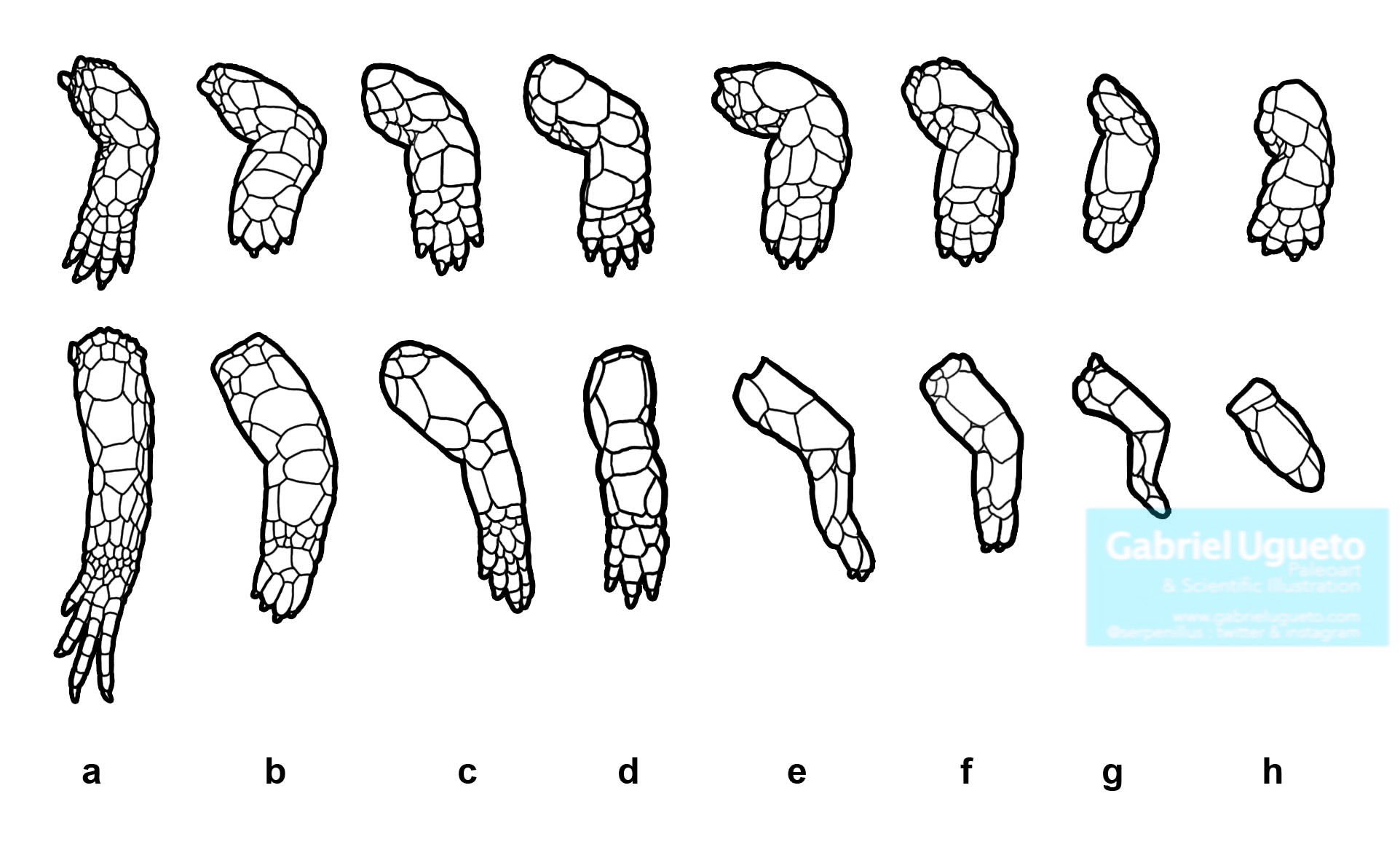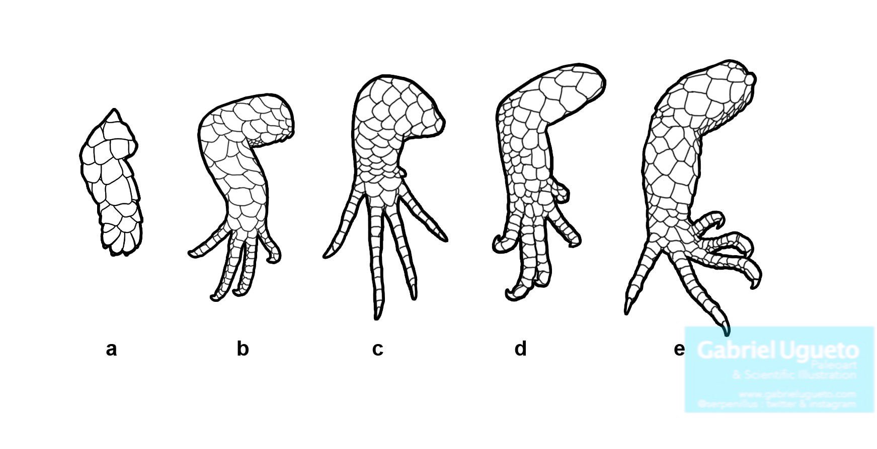 Reduction of limbs and digits in various Gymnophthalmids: a Bachia, b Gymnophthalmus (4 fingers), c Tretioscincus (5 fingers but 1st one very rudimentary), d Riolama (1st reduced and clawless) e Anadia (five digits presented and clawed)